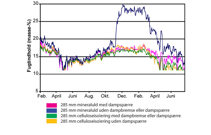 I vinterperioden kunne forskerne konstatere en uacceptabel høj fugtophobning på knap 30 pct. (træ-fugt) i elementerne isoleret med mineraluld, men uden dampspærre. Er der mere end 20 pct. fugt i træ, vokser risikoen for at træet bliver angrebet af råd og trænedbrydende svamp. I elementerne isoleret med cellulosefiber kom fugtindholdet derimod ikke over 18 pct., uanset om der blev benyttet dampspærre eller ej. Kilde: SBI-publikation 025 Fugtsikre træfacader