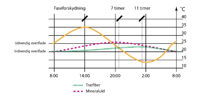 TræfiberDanmarkTræfiberisolering har stor ”varmekapacitet”, som afspejles i en større såkaldt faseforskydning hvilket giver stor oplevet komfort og faktisk nedsætter boligens reelle energibehov.